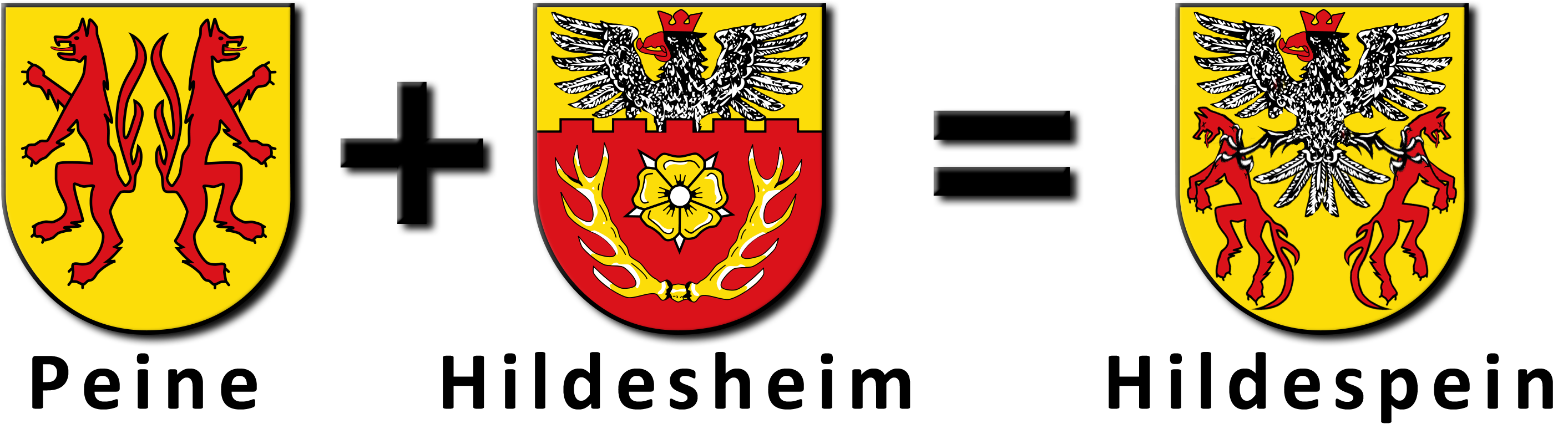 Das neue Wappen des zukünftigen Landkreises "Hildespein"Die Landkreise Peine und Hildesheim sollen nach Wunsch der beiden Kreisräte Einhaus und Wegner bis 2016 miteinander fusionieren. Der Name des neuen Landkreises steht noch nicht fest, "Hildespein" würde sich aber aus verschiedenen Gründen anbieten, wenn nicht gar aufdrängen. Um Kosten für lange Ideenfindungen und Designstudien einzusparen, hat sich ein Peiner Bürger schon mal mit der Gestaltung des neuen gemeinsamen Wappens beschäftigt.